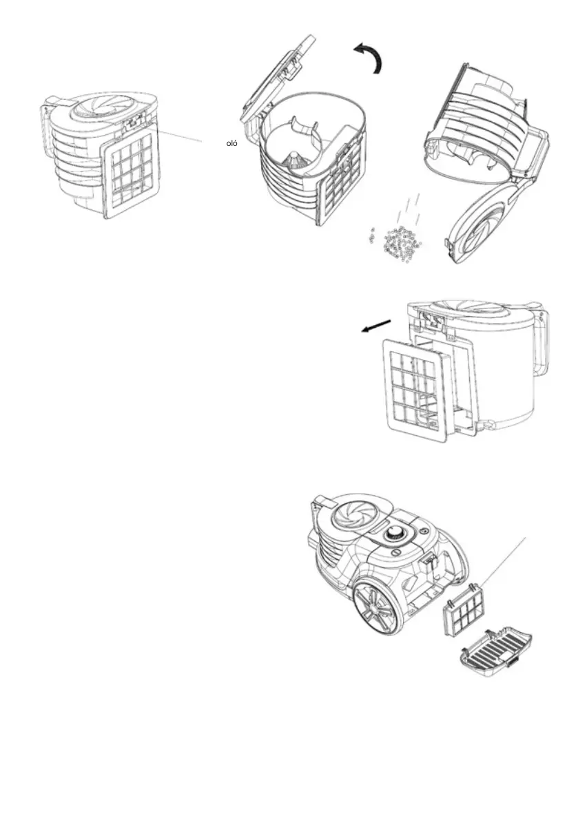 2. Scoateţi recipientul pentru praf şi scoateţi filtrul.