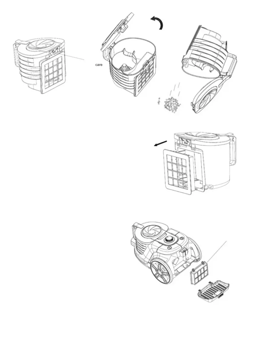 2. Scoateţi recipientul pentru praf şi scoateţi filtrul.