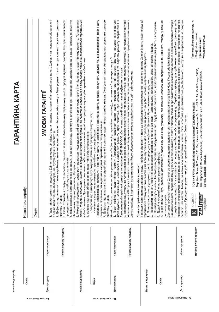 даного періоду. З повними умовами гарантійного обслуговування можна ознайомитися на сайті zelmer.com.uа.