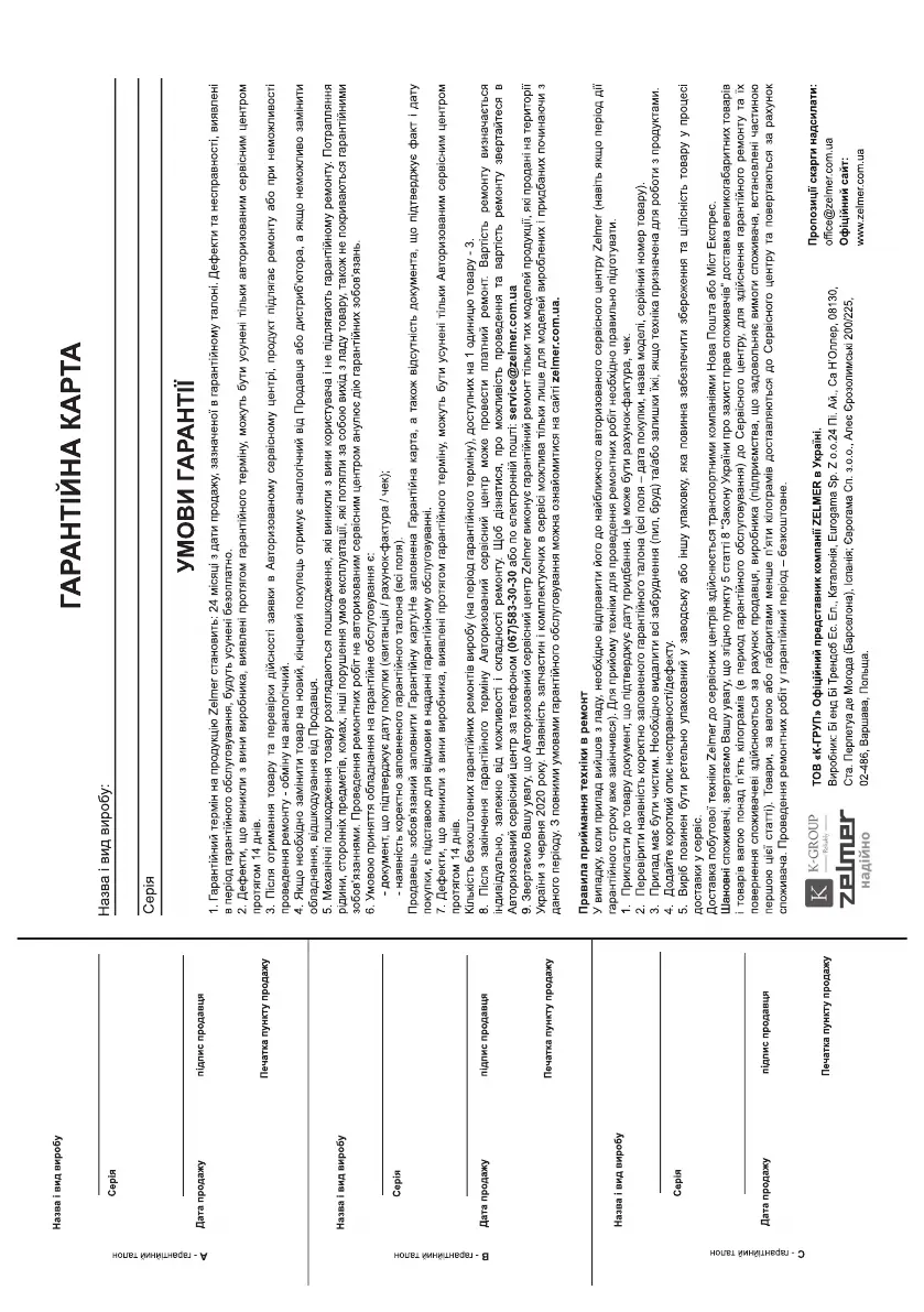 даного періоду. З повними умовами гарантійного обслуговування можна ознайомитися на сайті zelmer.com.uа.