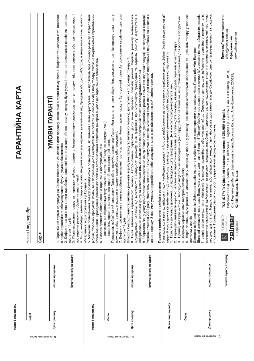 даного періоду. З повними умовами гарантійного обслуговування можна ознайомитися на сайті zelmer.com.uа.