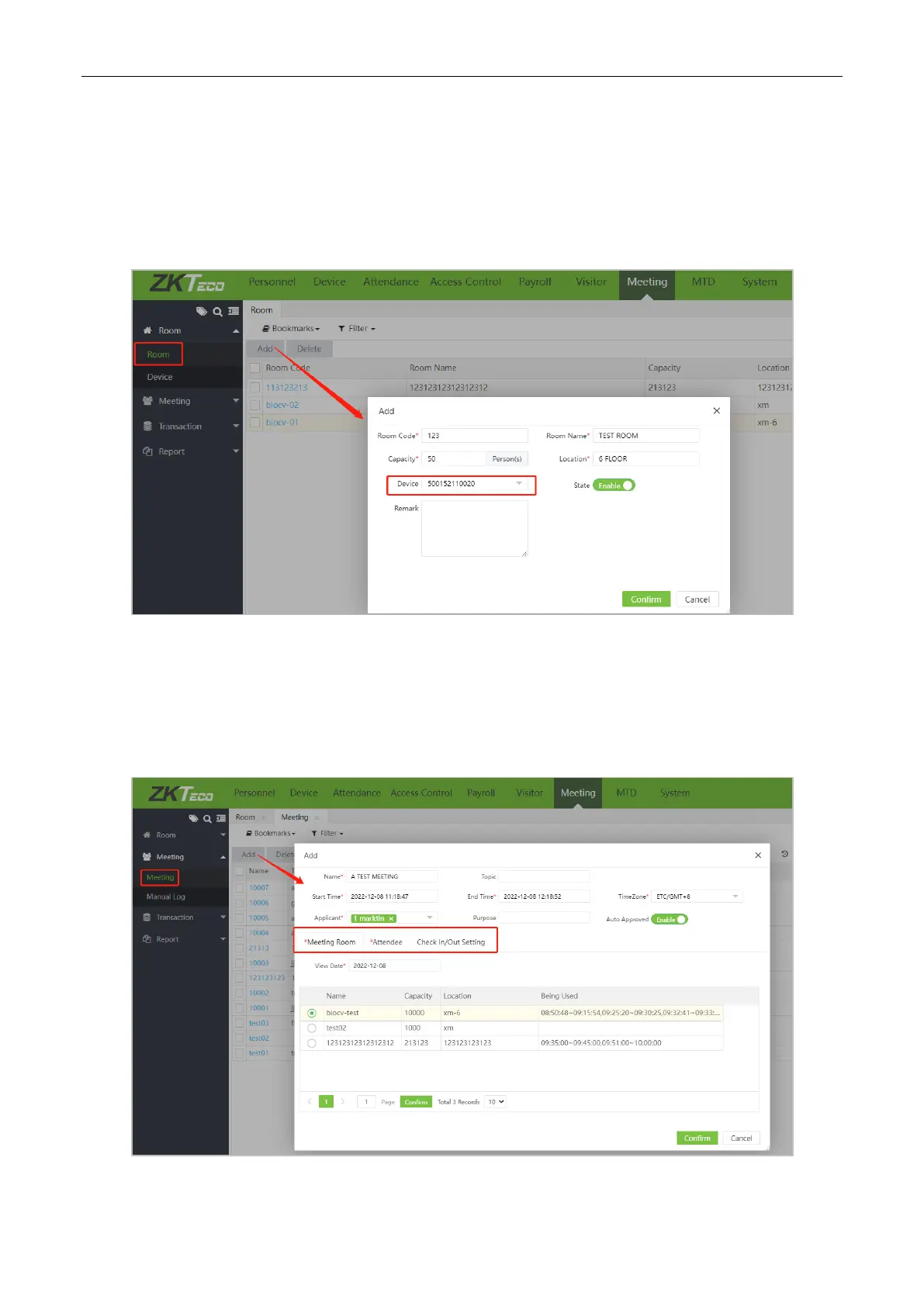 In Meeting module, open the [Room] menu. Click the [Add] button, filling the meeting room information,