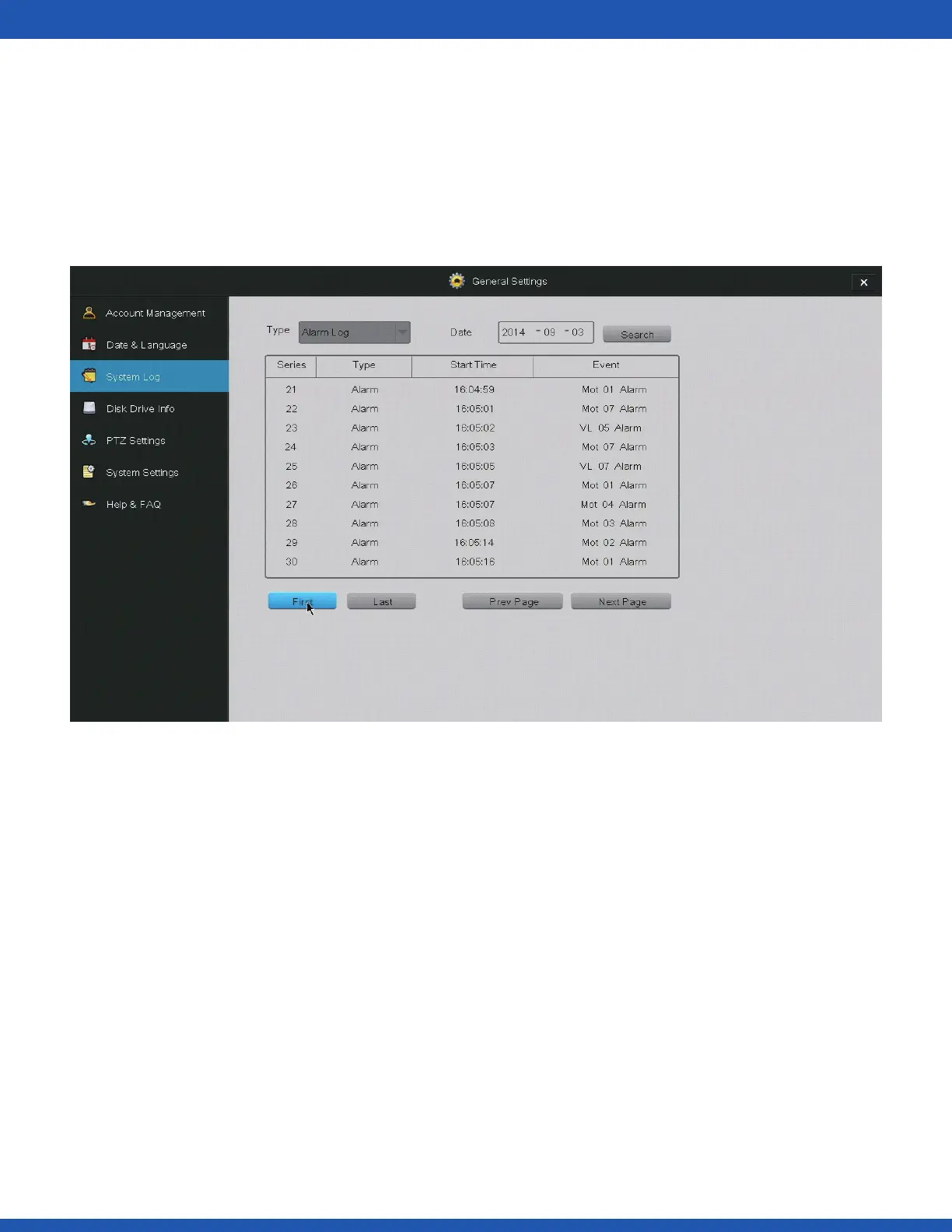 sensors, activated alarms, etc. Use this menu to review the system log of all event