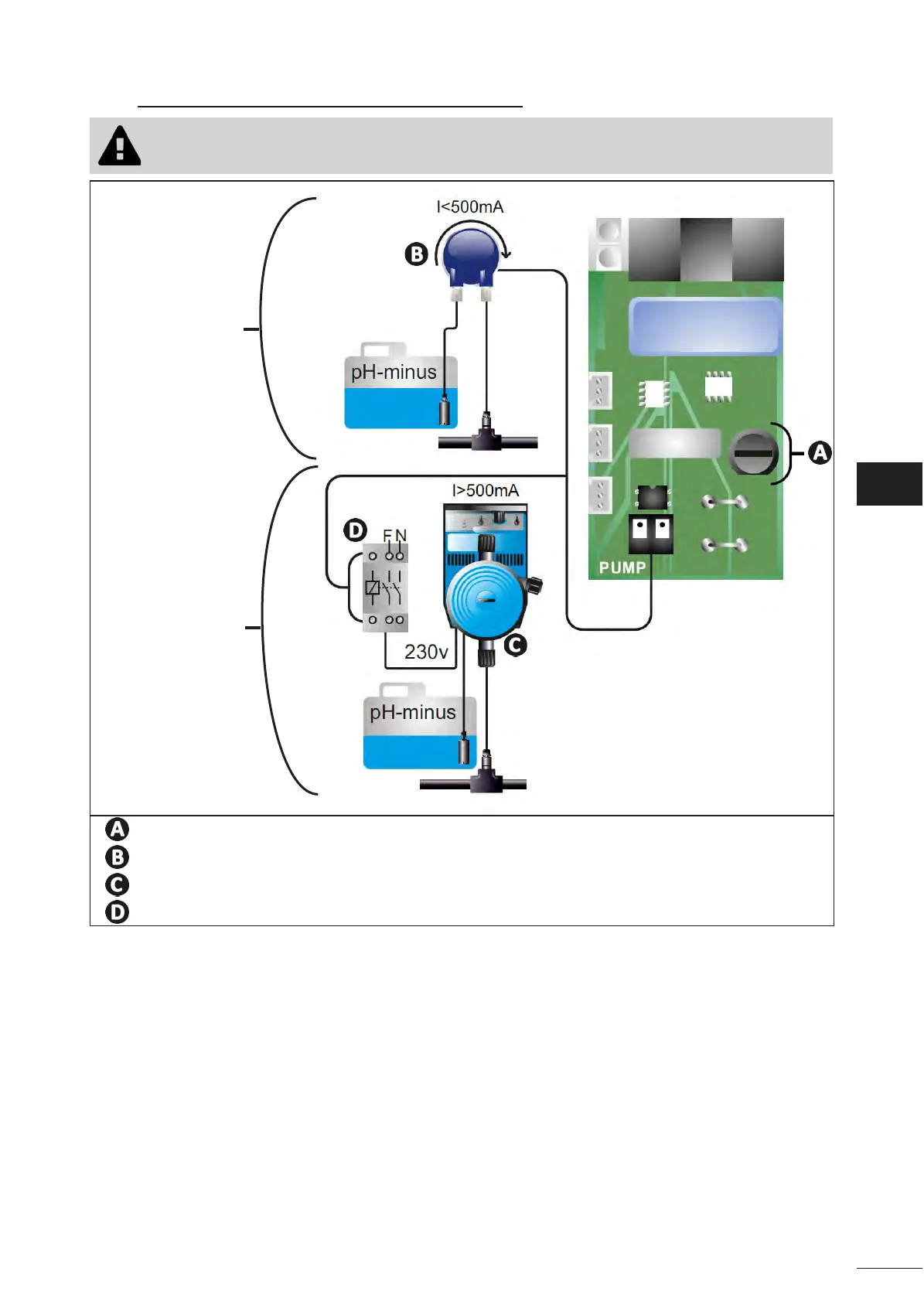• Al di sopra di 500 mA, il collegamento alla pompa pH deve essere proteo da un disgiuntore con