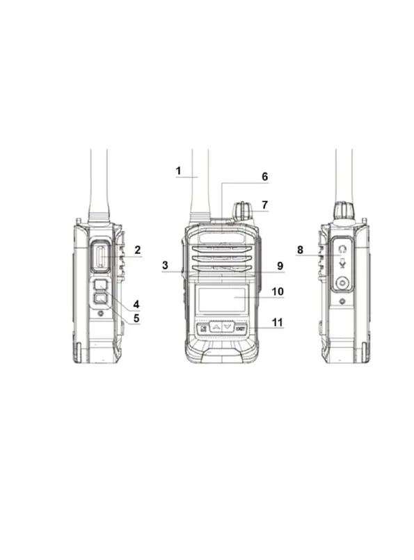 1 = Antenna | 2 = Pulsante di trasmissione (PTT) | 3 = Microfono | 4 = Pulsante