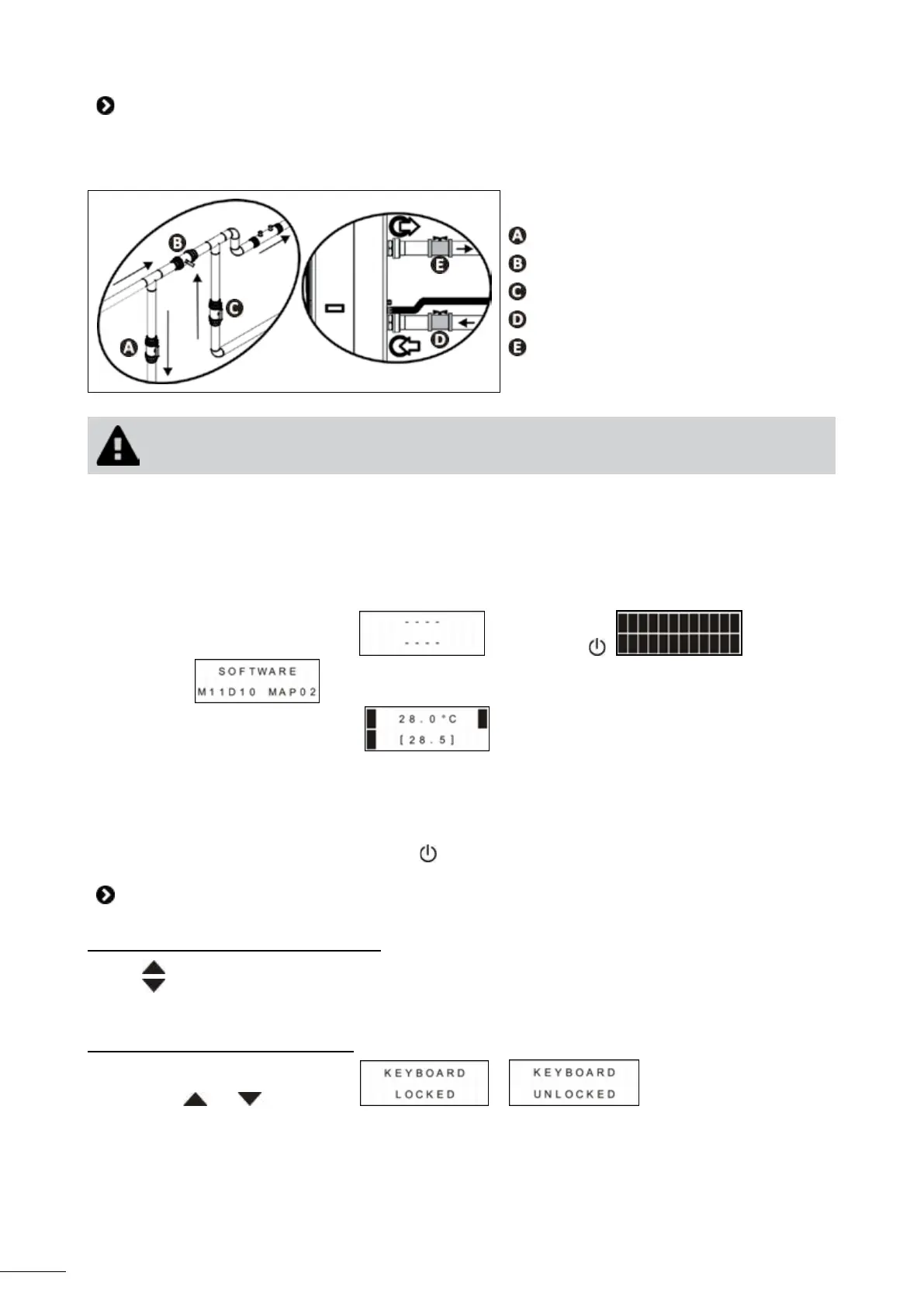 • Open valves A, C and D fully then valve E by half (the air which has built up in the heat pump condenser and the