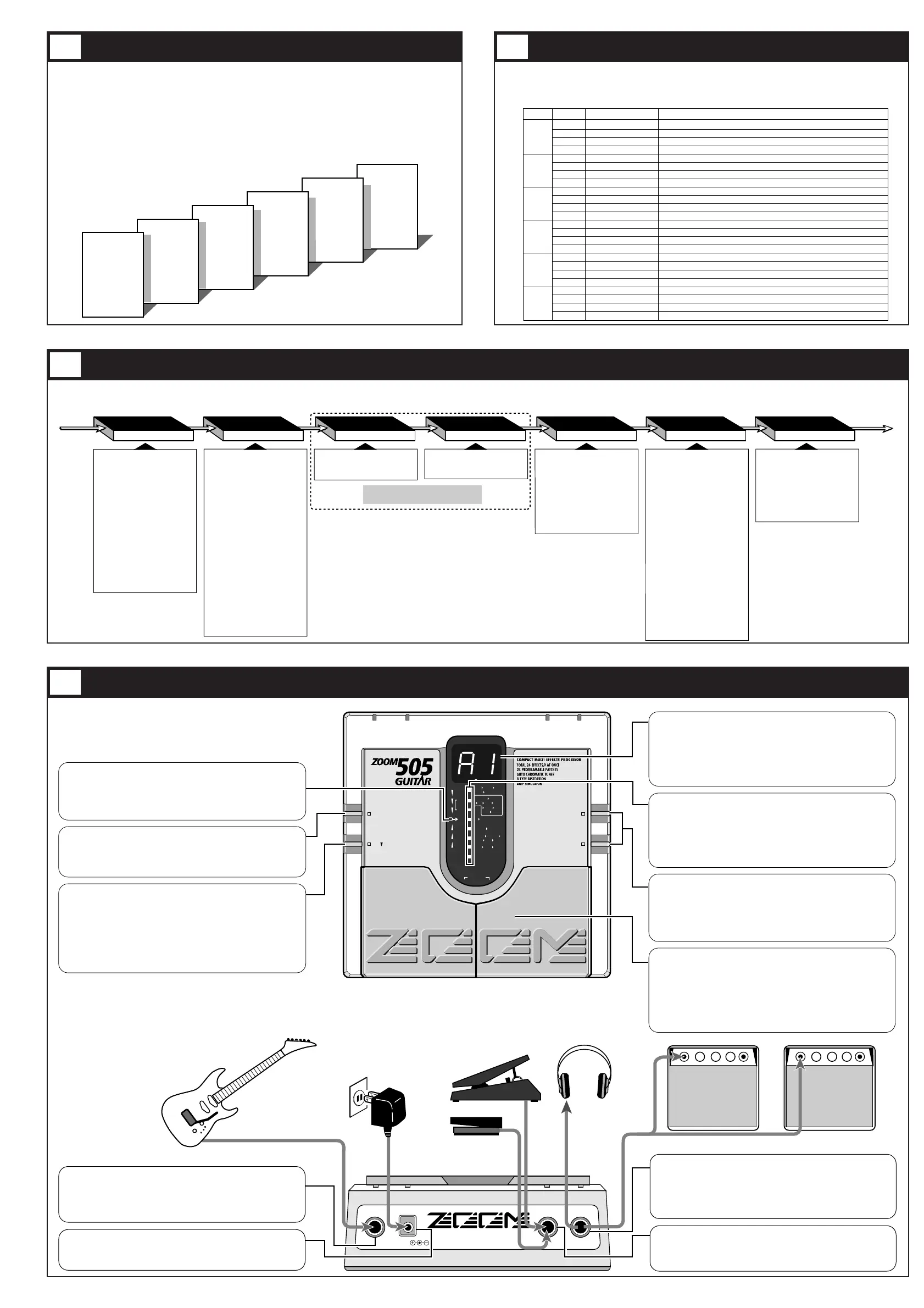 As shown in the illustration below, the 505 can be thought to contain seven "effect modules" which are