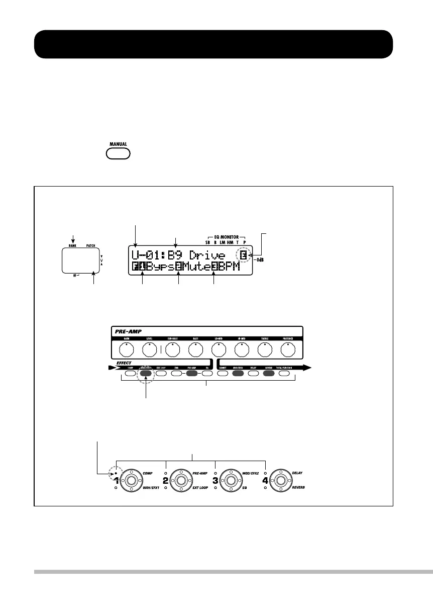 現在選ばれているパッチに対応するフットスイッチのLEDが点灯します。