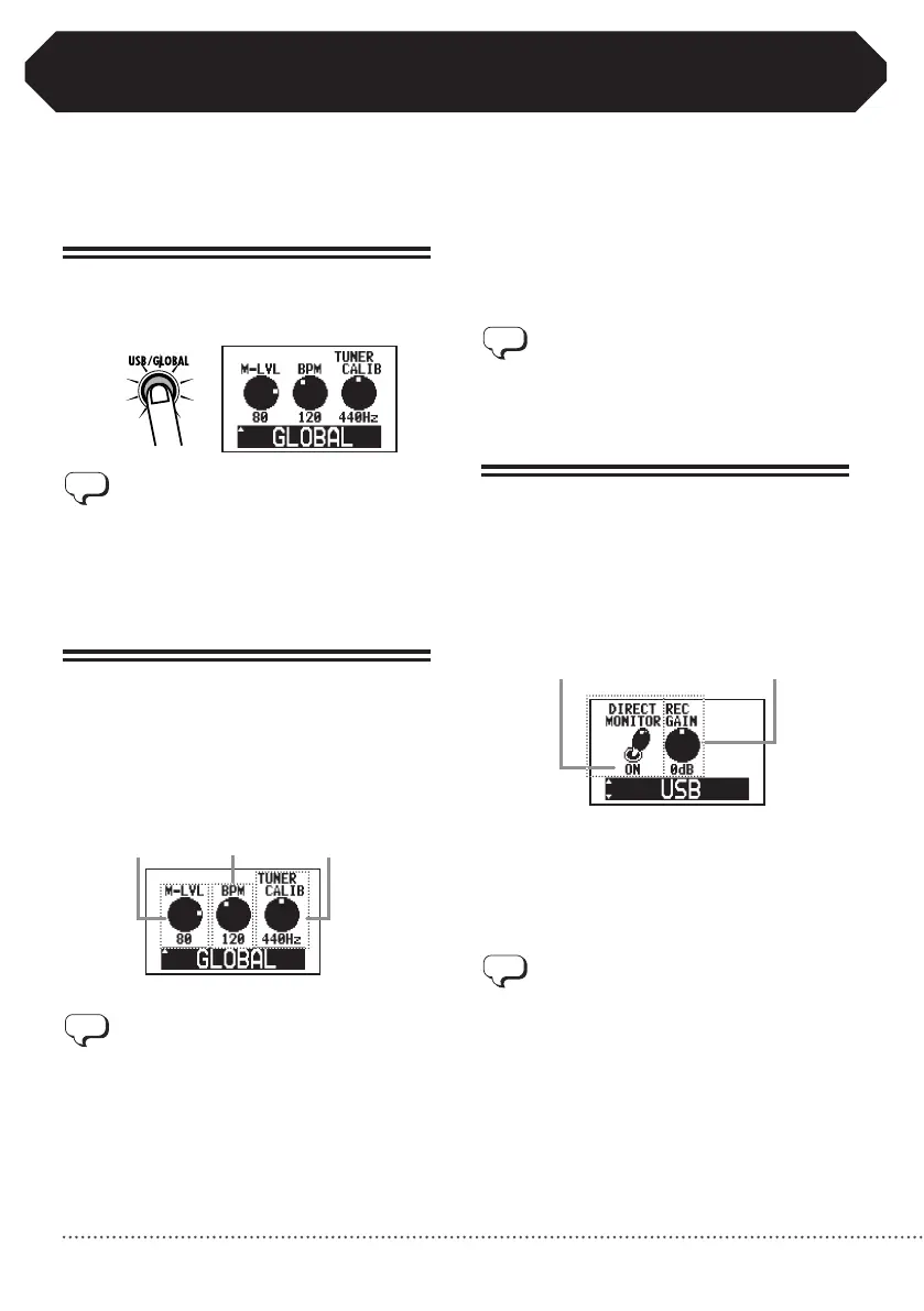 Usingtheglobalmenus,youcanchangevarioussettingsrelatedtothemasterlevel,display,USBandotheritems.