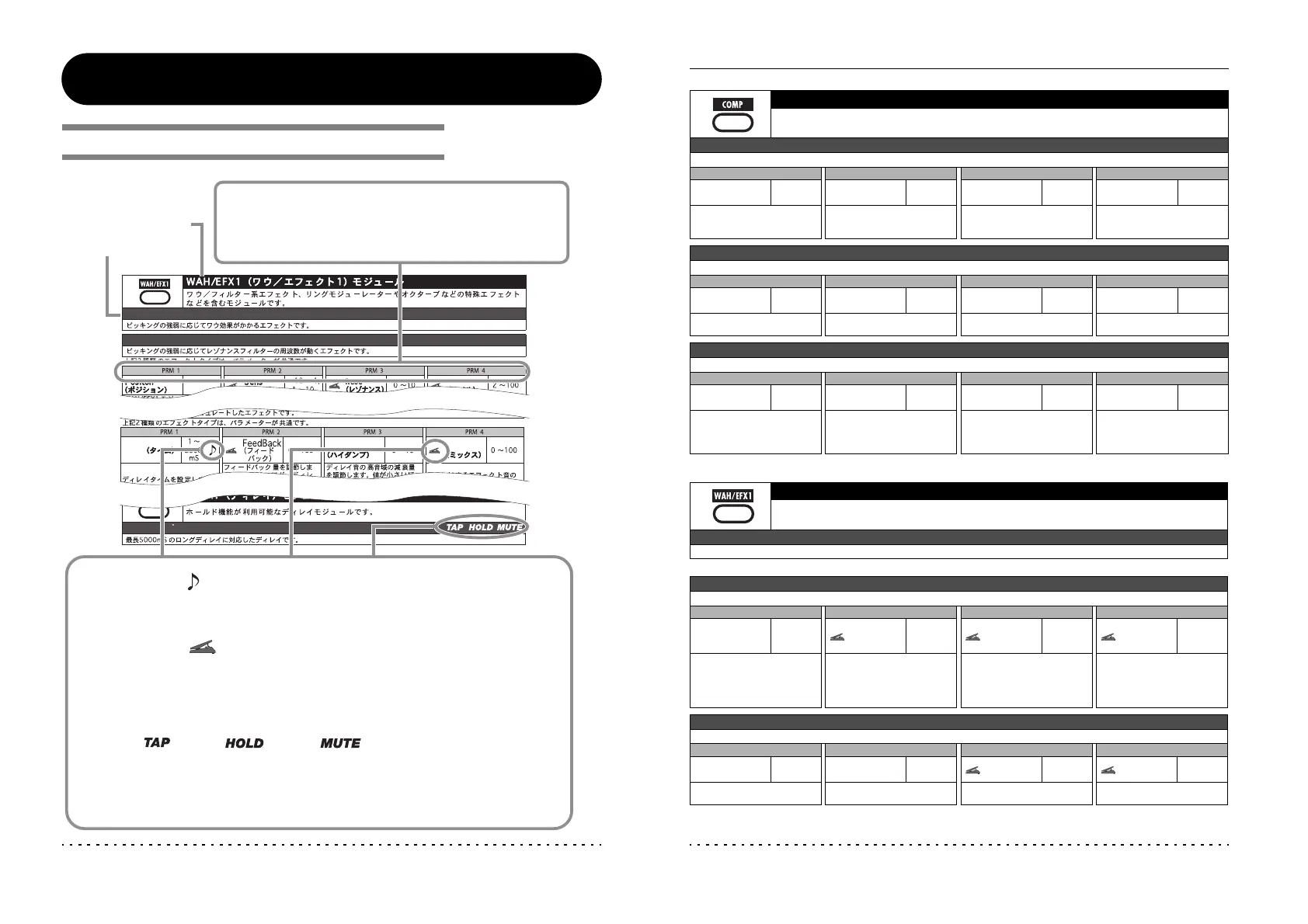 れファンクションフットスイッチ1/2を使ってディレイタイムの指定(TAP)、ホールドディレイ機能のオン