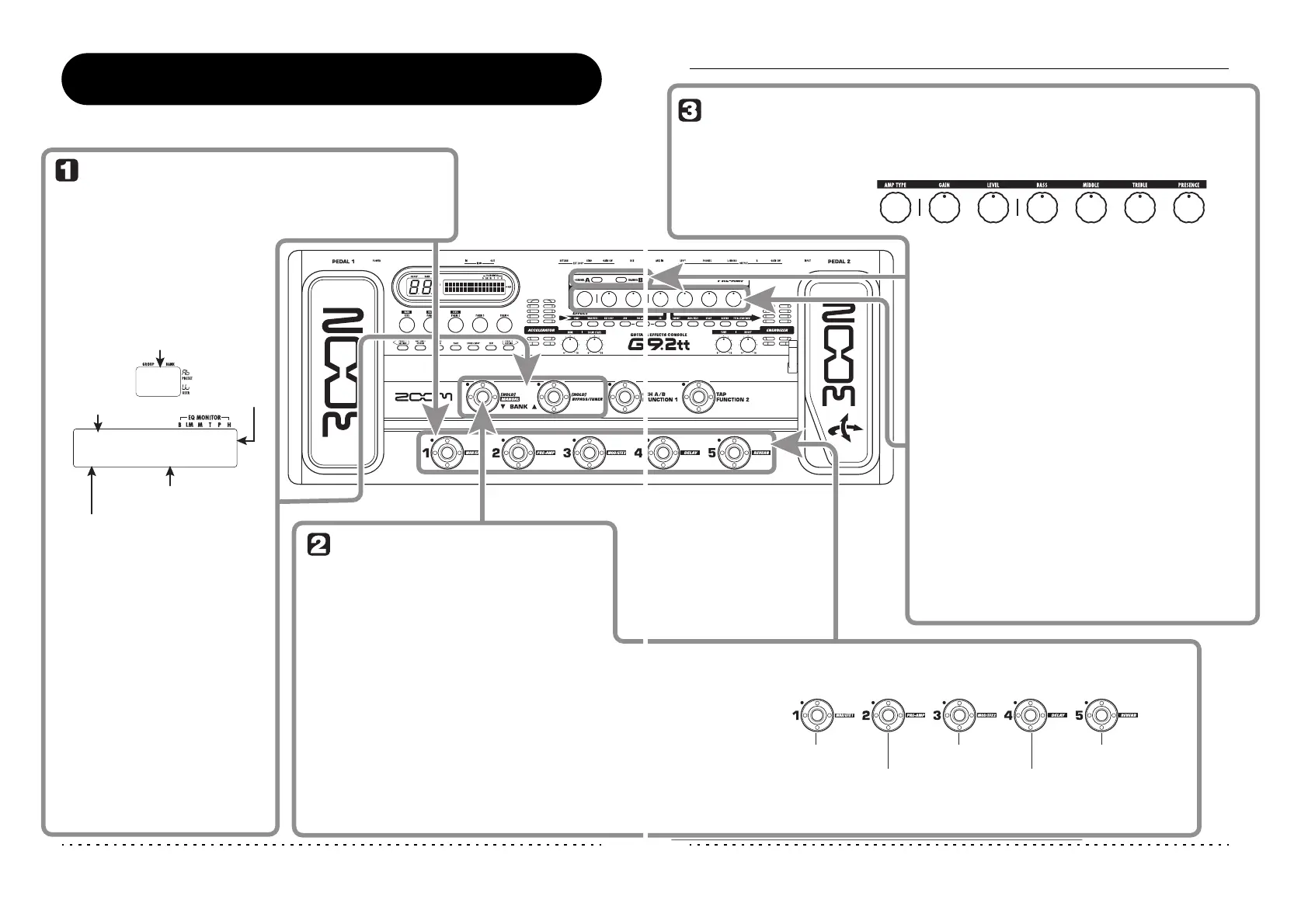 1.パッチを選ぶには、フットスイッチ1〜5を踏んでください。
