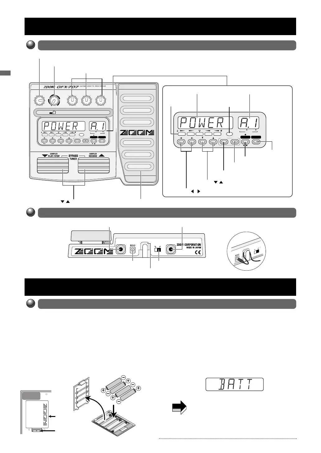 The GFX-707 can be powered either by alkaline batteries or by an AC adapter. To use the unit