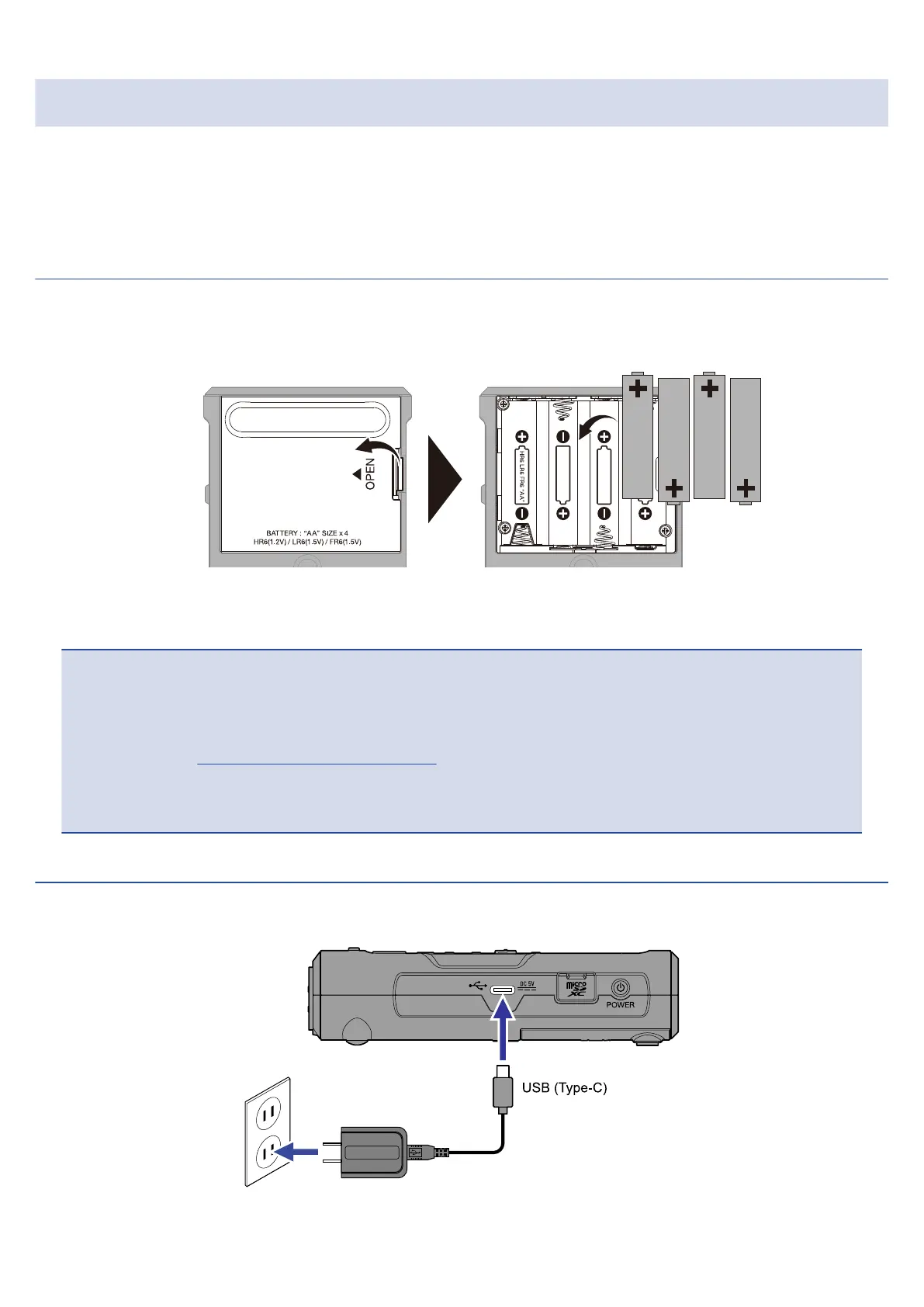 A power supply connected to the USB port will be used instead of AA batteries when available.