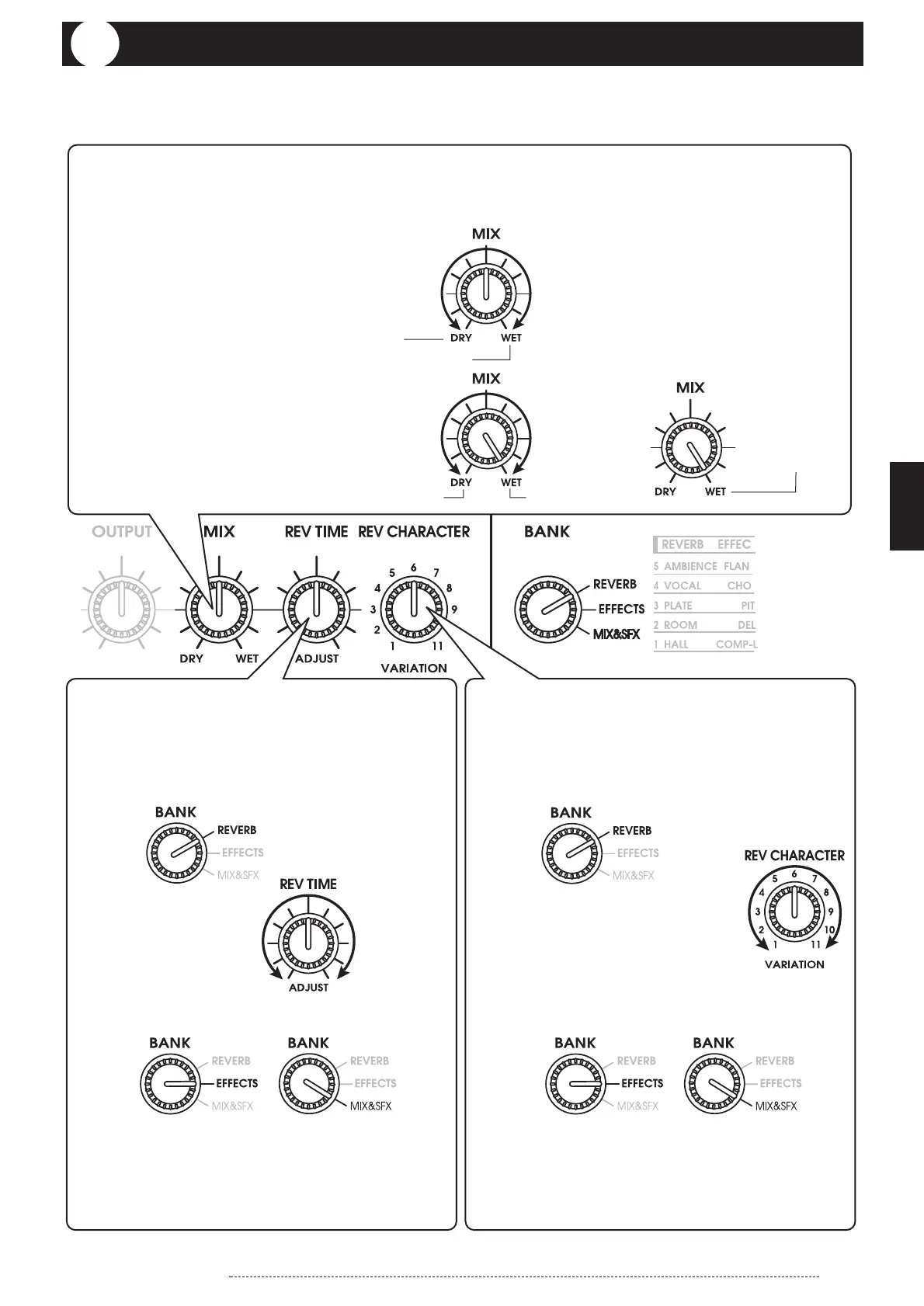 The following controls are available for changing the sound character and intensity of the preset effects of the RFX-1100