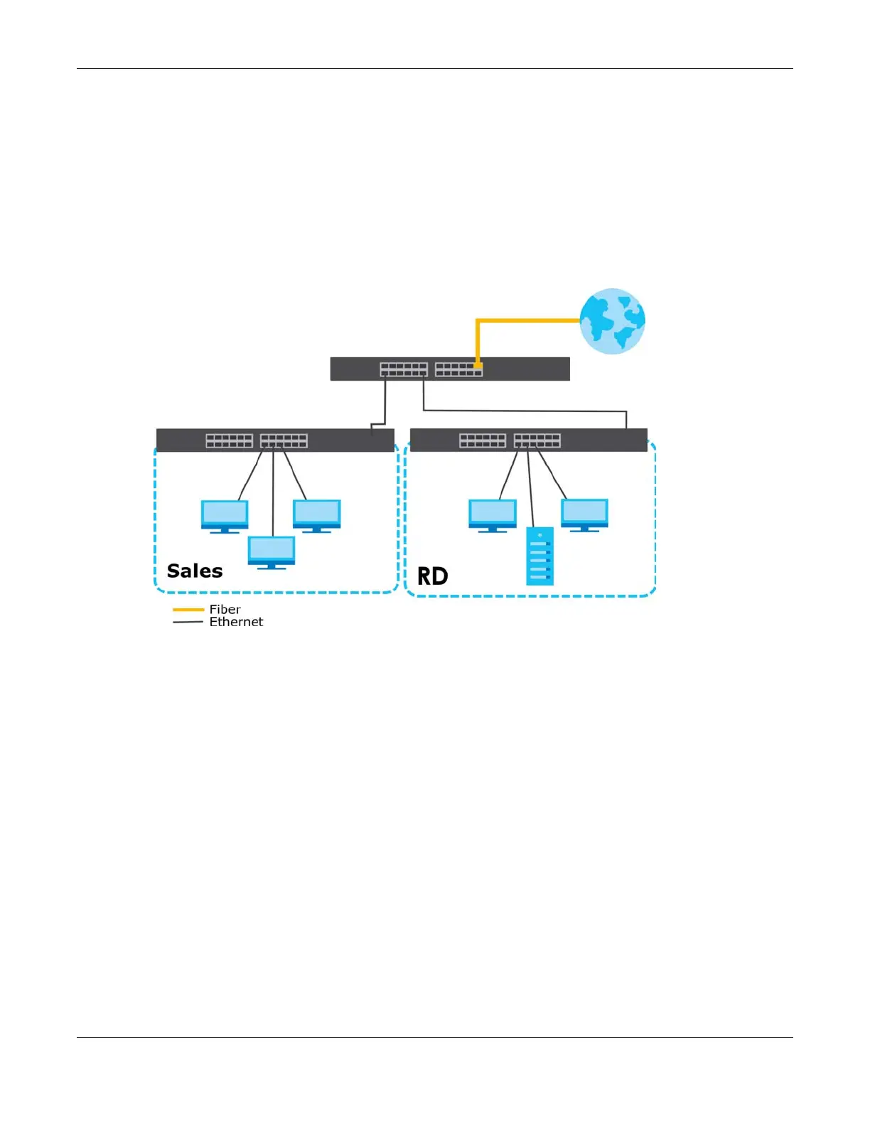 In this example, the Switch connects different company departments (RD and Sales) to the corporate